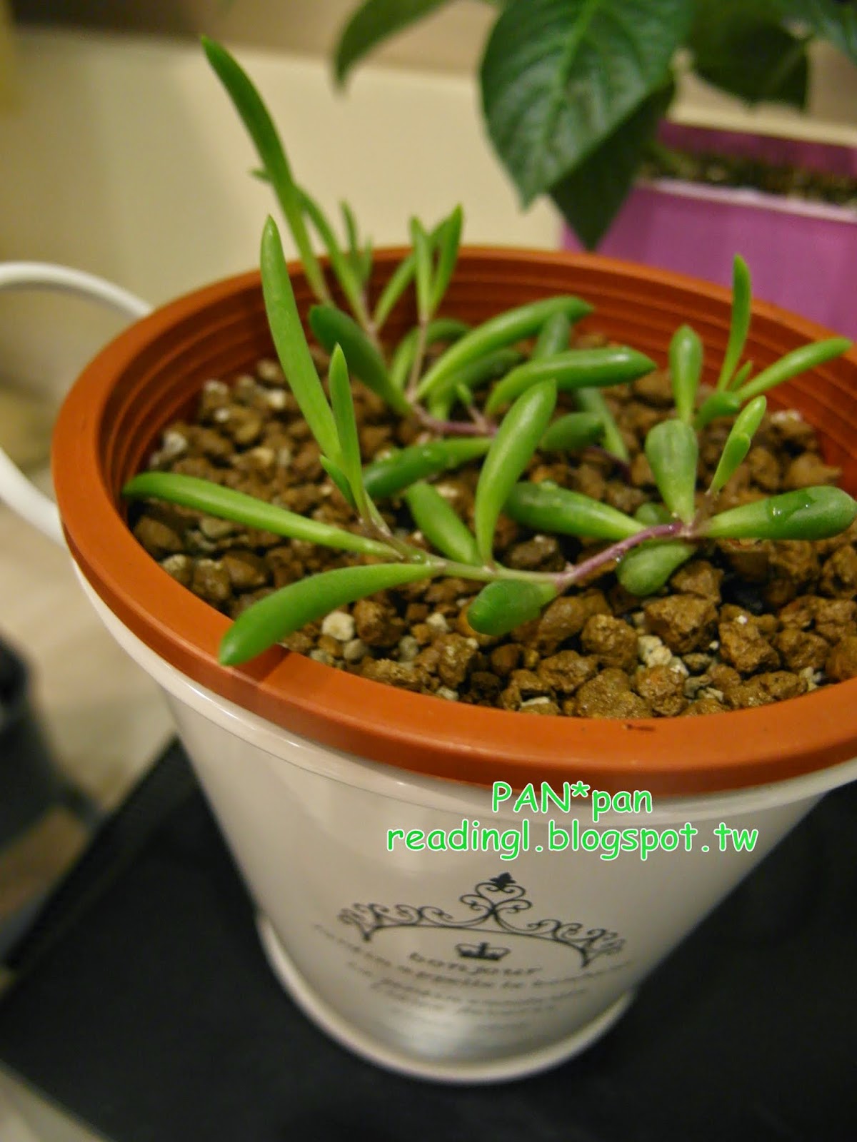 去宜得利幫他買了一個可愛的外盆來套,匍匐生長中,中間段已經都有生根囉~