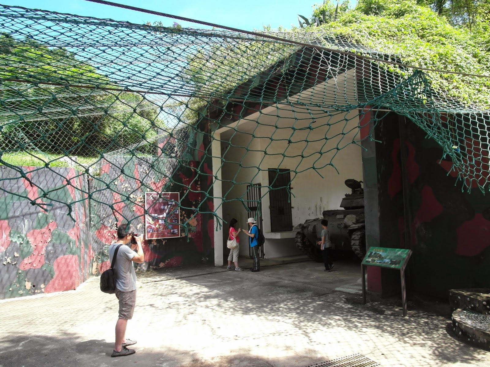 走出坑道,一台貨真價實的戰車矗立在我眼前。說真的,不來金門,一般人也沒有什麼機會能與真的戰車接觸吧!上頭的網子只要加上草皮,就像電影裡演的一樣,能掩蔽戰車不讓敵人發現。當初這種停放在海邊的輕戰車,主要任務就是進行此片海域的灘岸掃蕩!