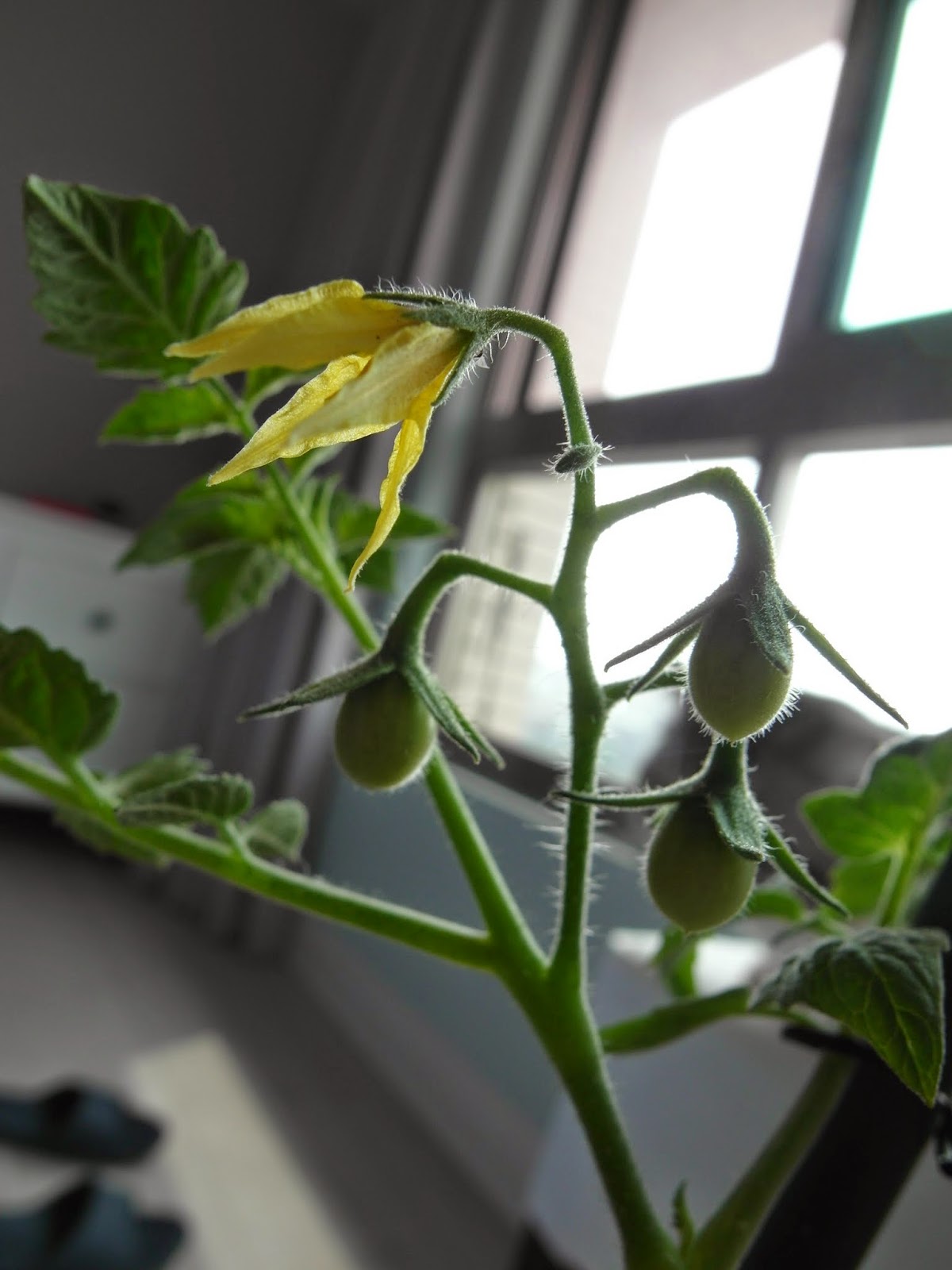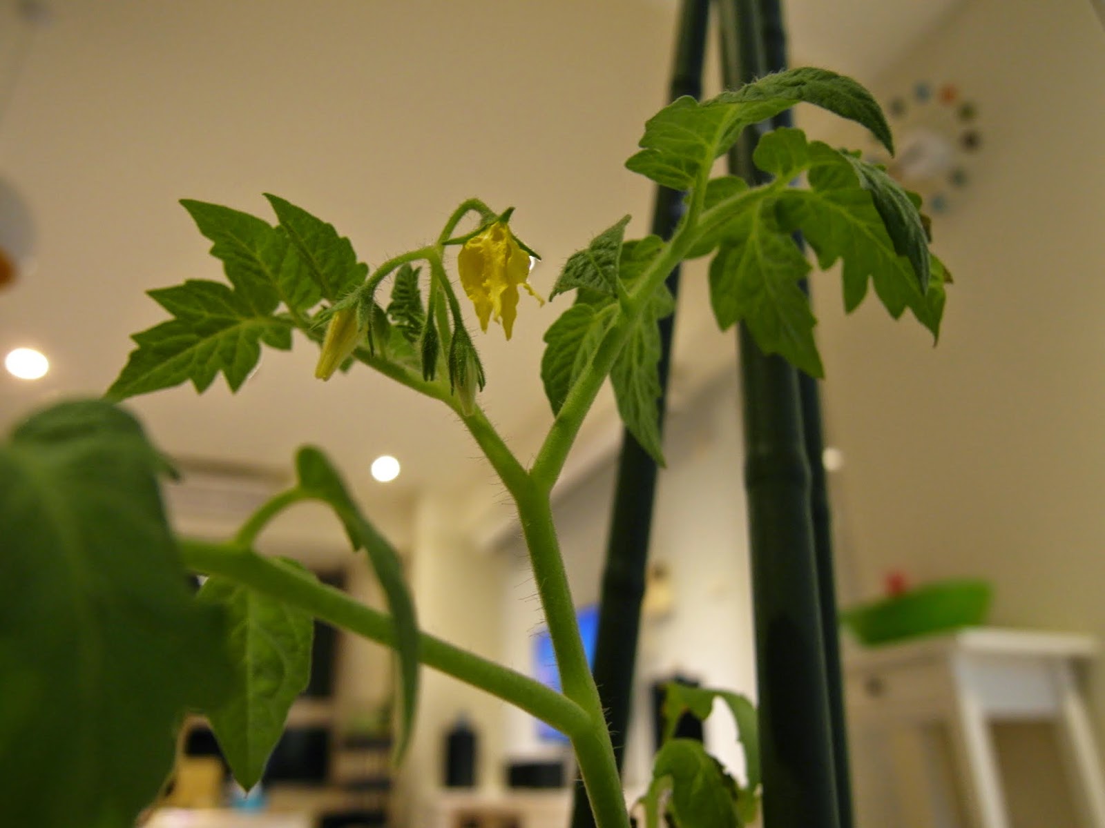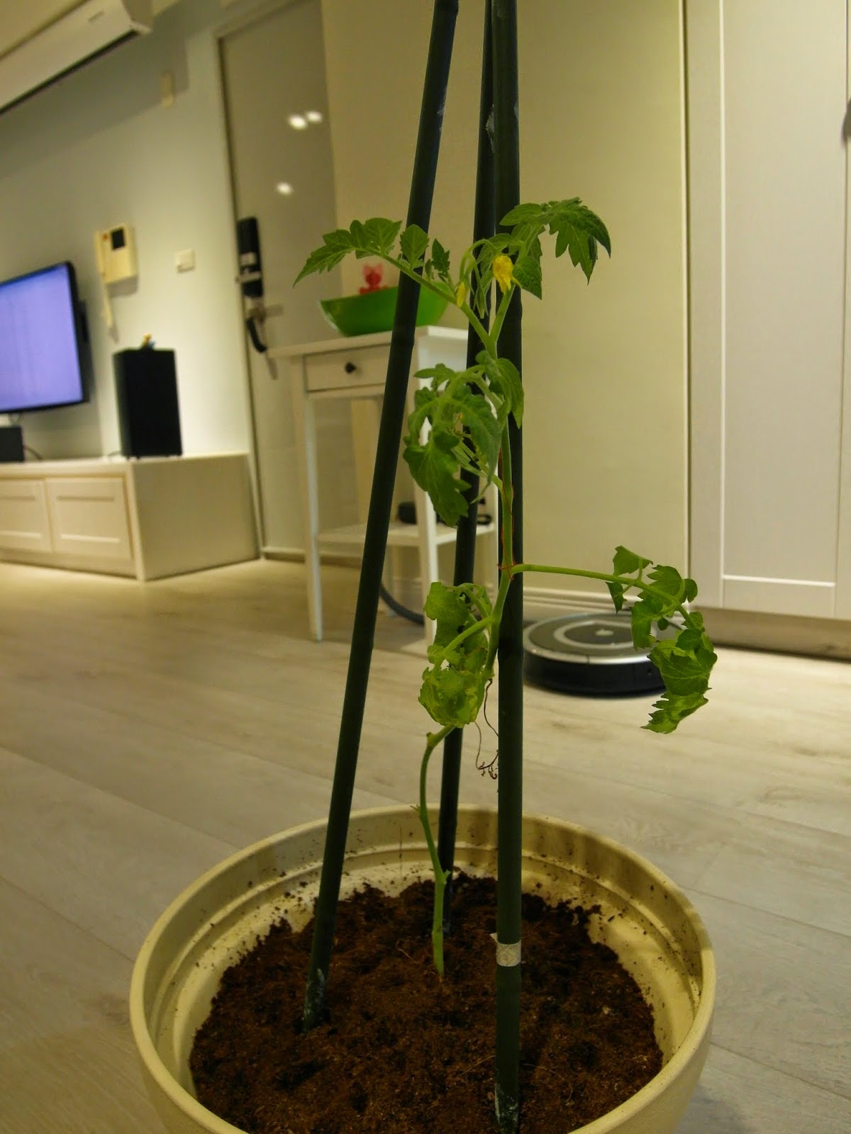 使用完終極祕密武器後,再也不見小黑蟲了!也把蕃茄拿到窗外放,但因為風勢太大,有3棵的主莖幹被吹斷後,就回天乏術了。剩最後一棵,終於長出了第一批小黃花。