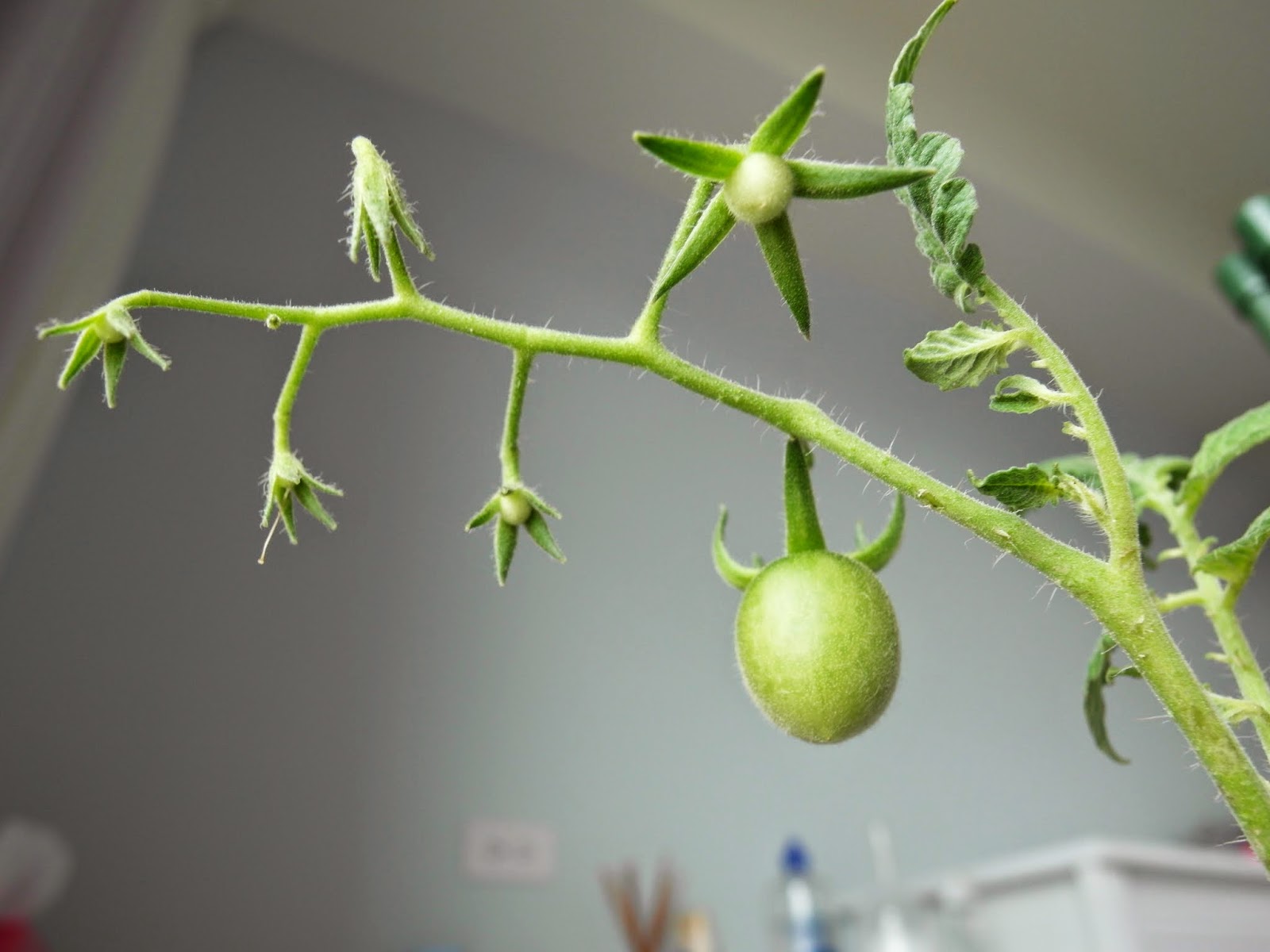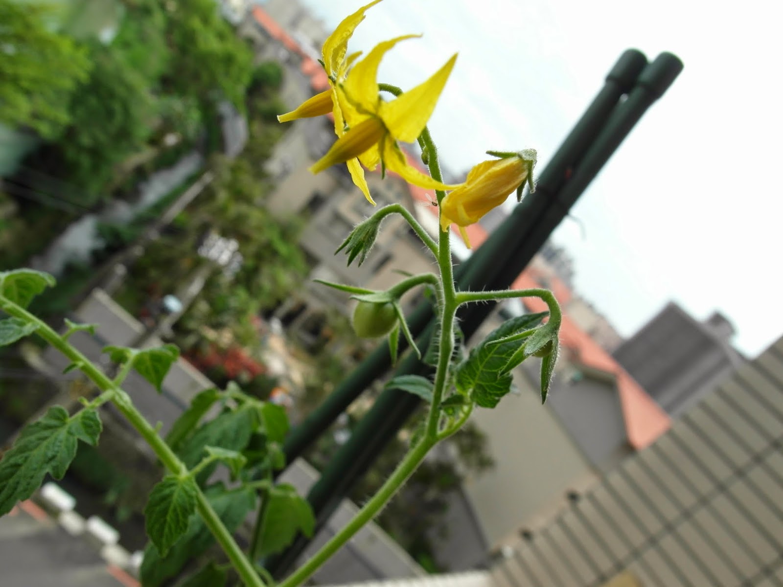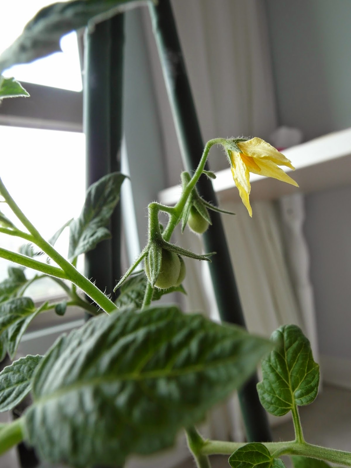 使用完終極祕密武器後,再也不見小黑蟲了!也把蕃茄拿到窗外放,但因為風勢太大,有3棵的主莖幹被吹斷後,就回天乏術了。剩最後一棵,終於長出了第一批小黃花。