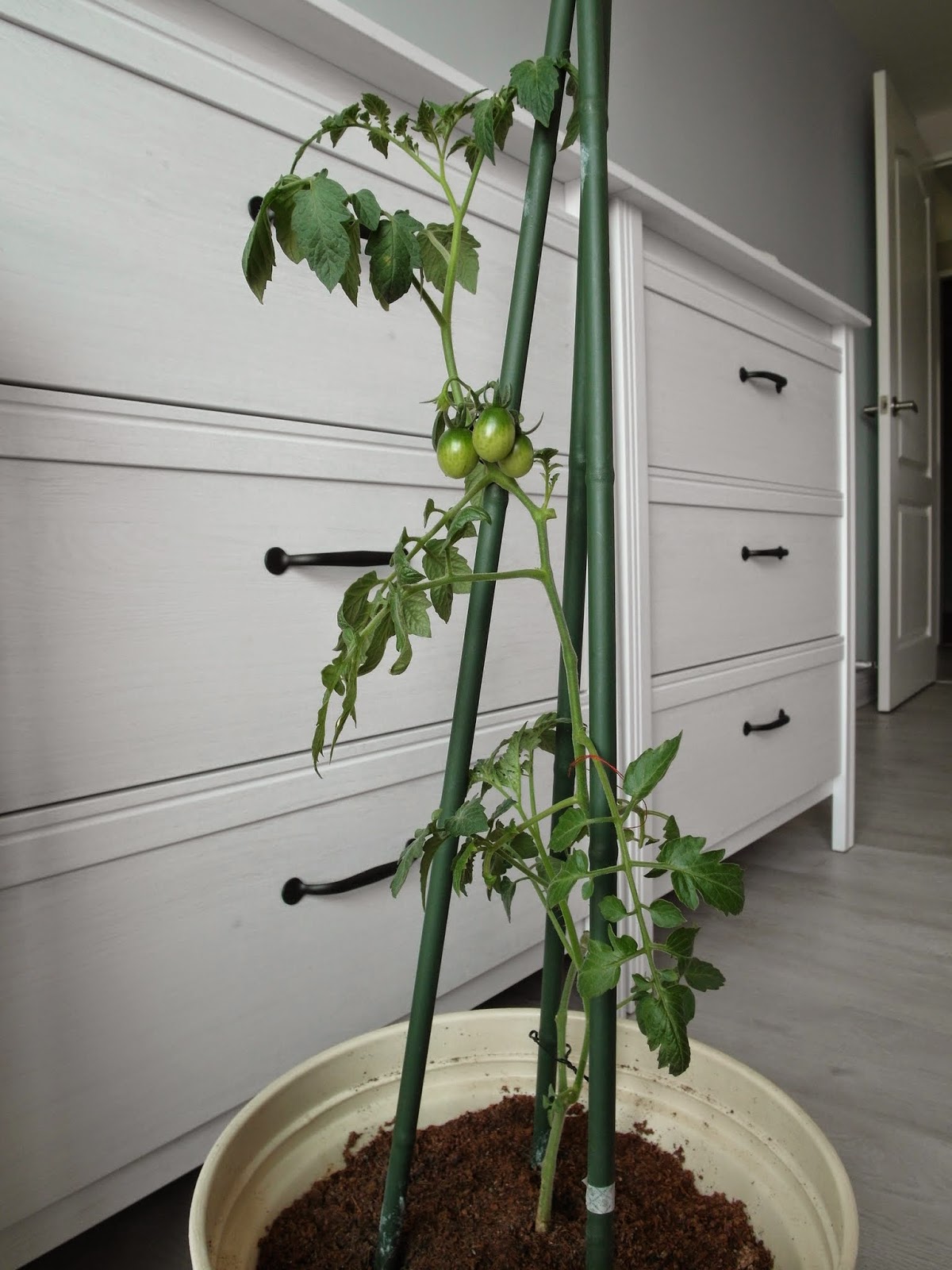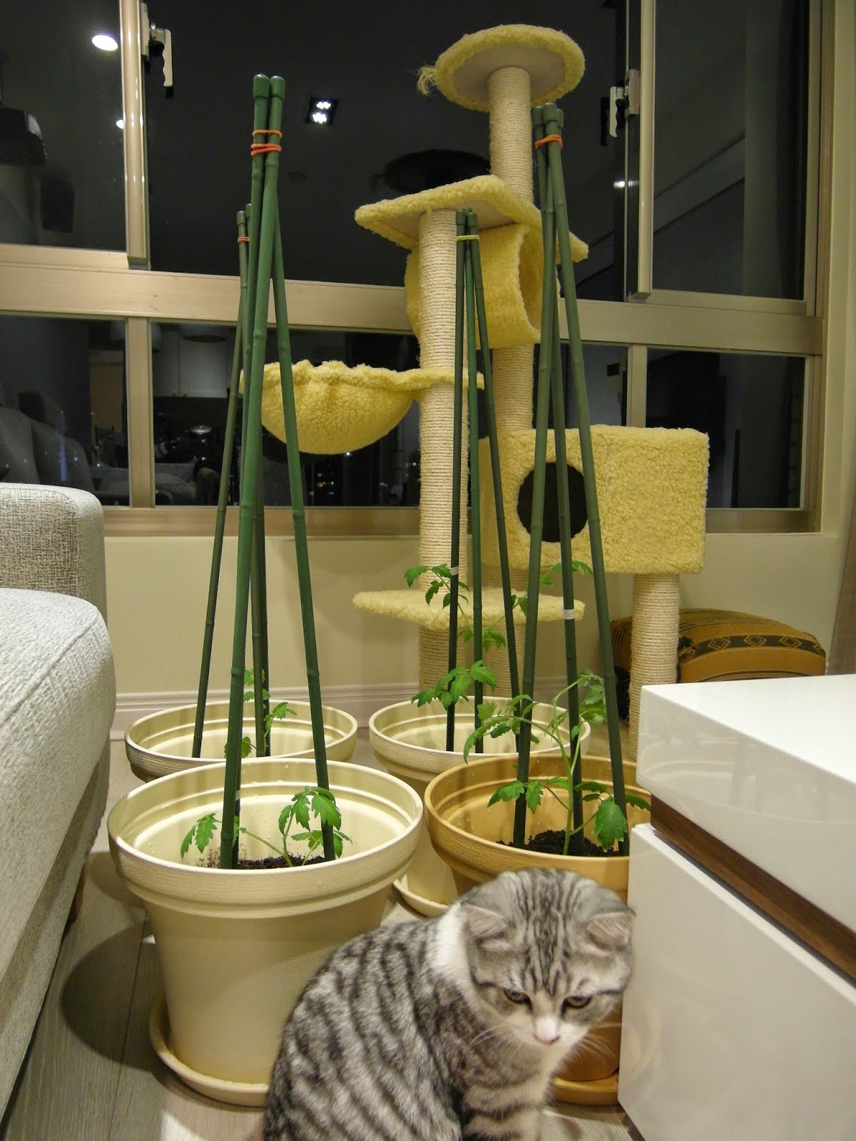 漂亮的觀賞用花草其實沒有很吸引我...(因為永遠都只能看不能吃啊),所以既然種了蕃茄,當然就要以能長出蕃茄為最終目的啊!(是有多想吃XD)但蕃茄是需要架網子來攀爬莖蔓的,家裡又不可能放網子...查了一些資料,才找到簡易的搭架方式,立馬去買工具回來~~