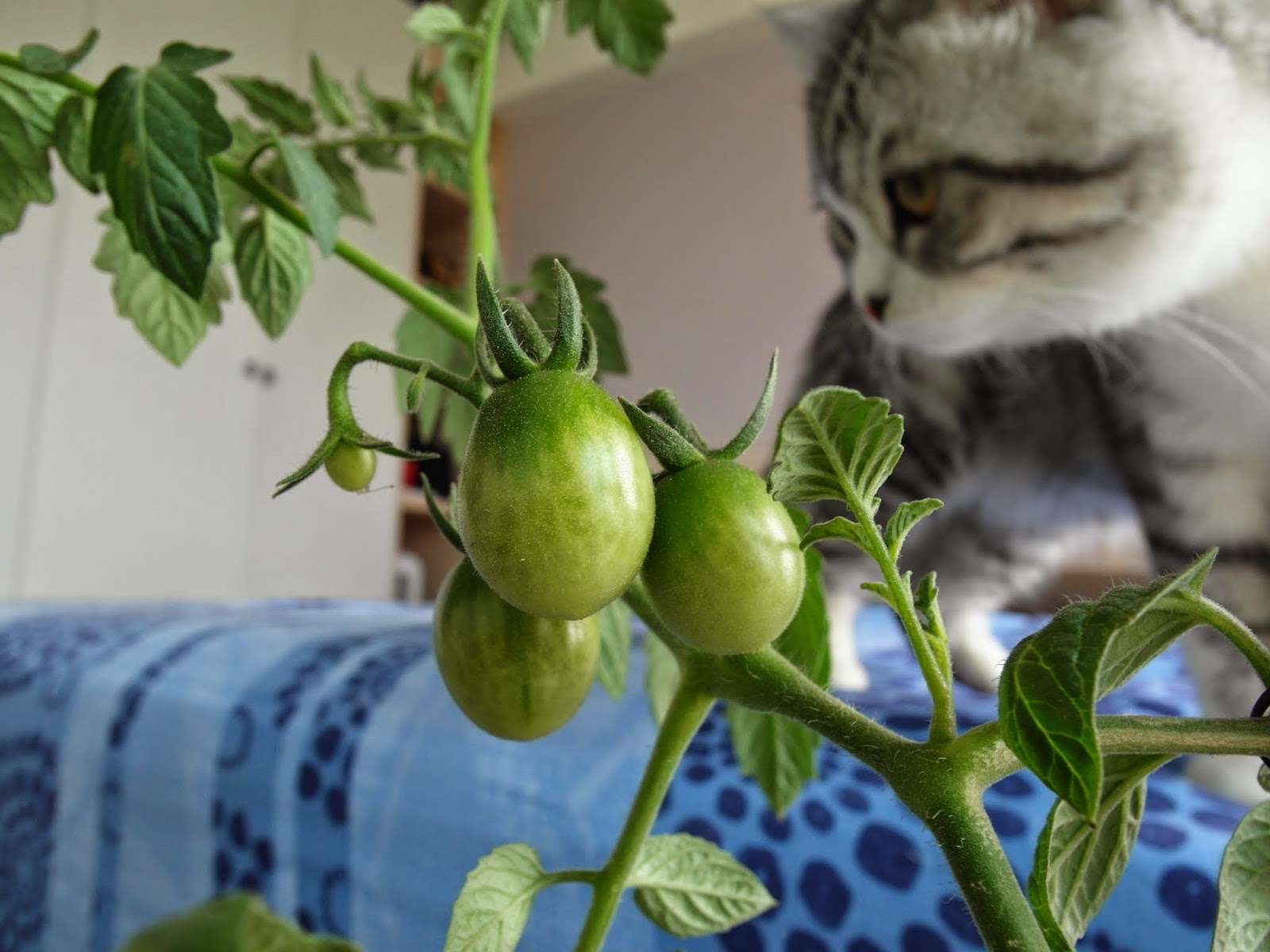 綠色小蕃茄持續茁壯中。第四朵花謝了之後也長出小蕃茄囉!