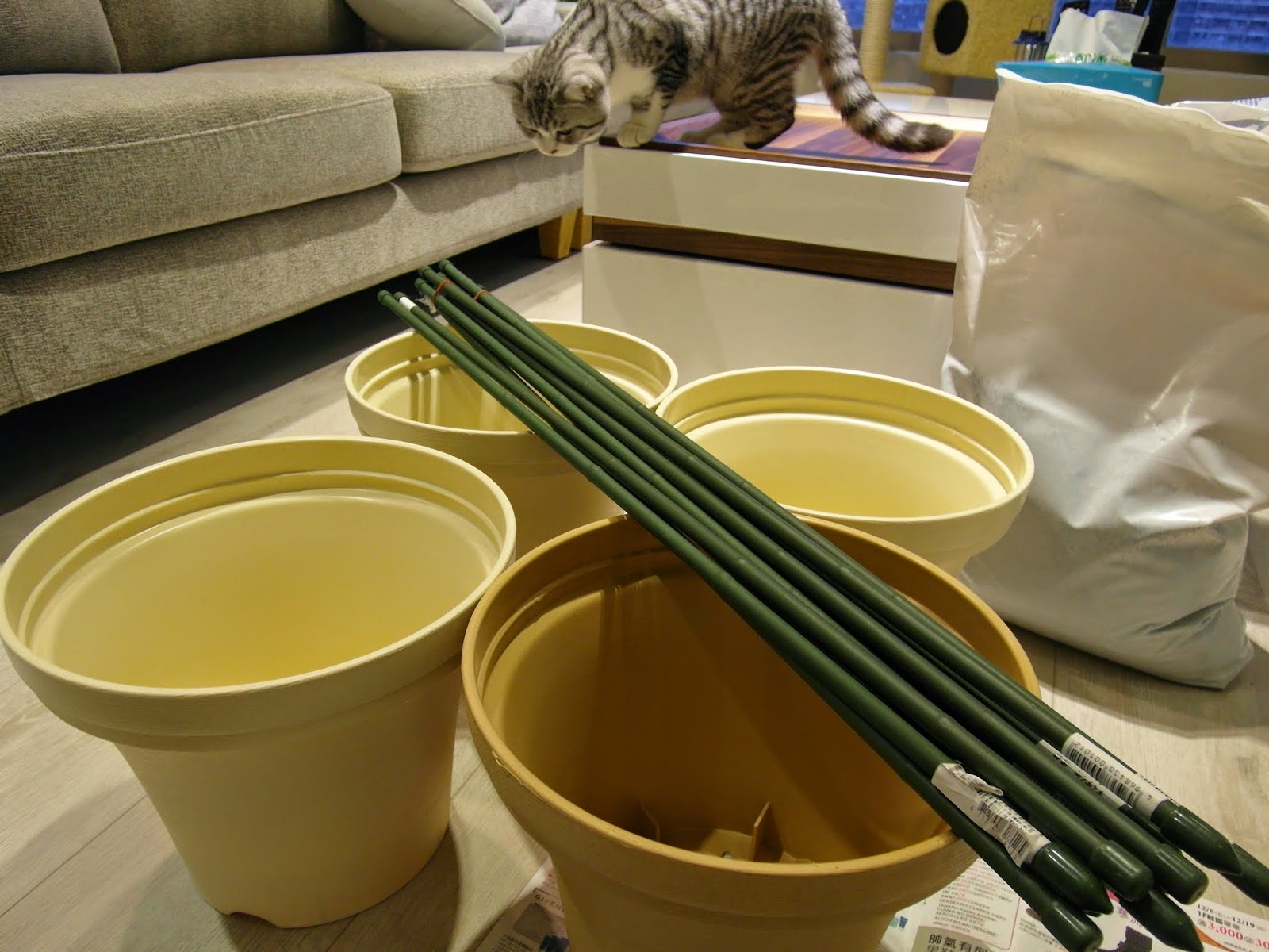 工具:90cm的支架*12支、直徑約23cm的盆子*4個+底盤、全能培養土一包