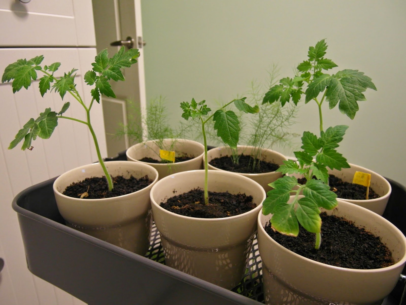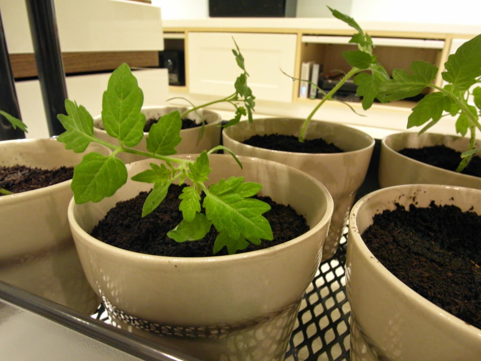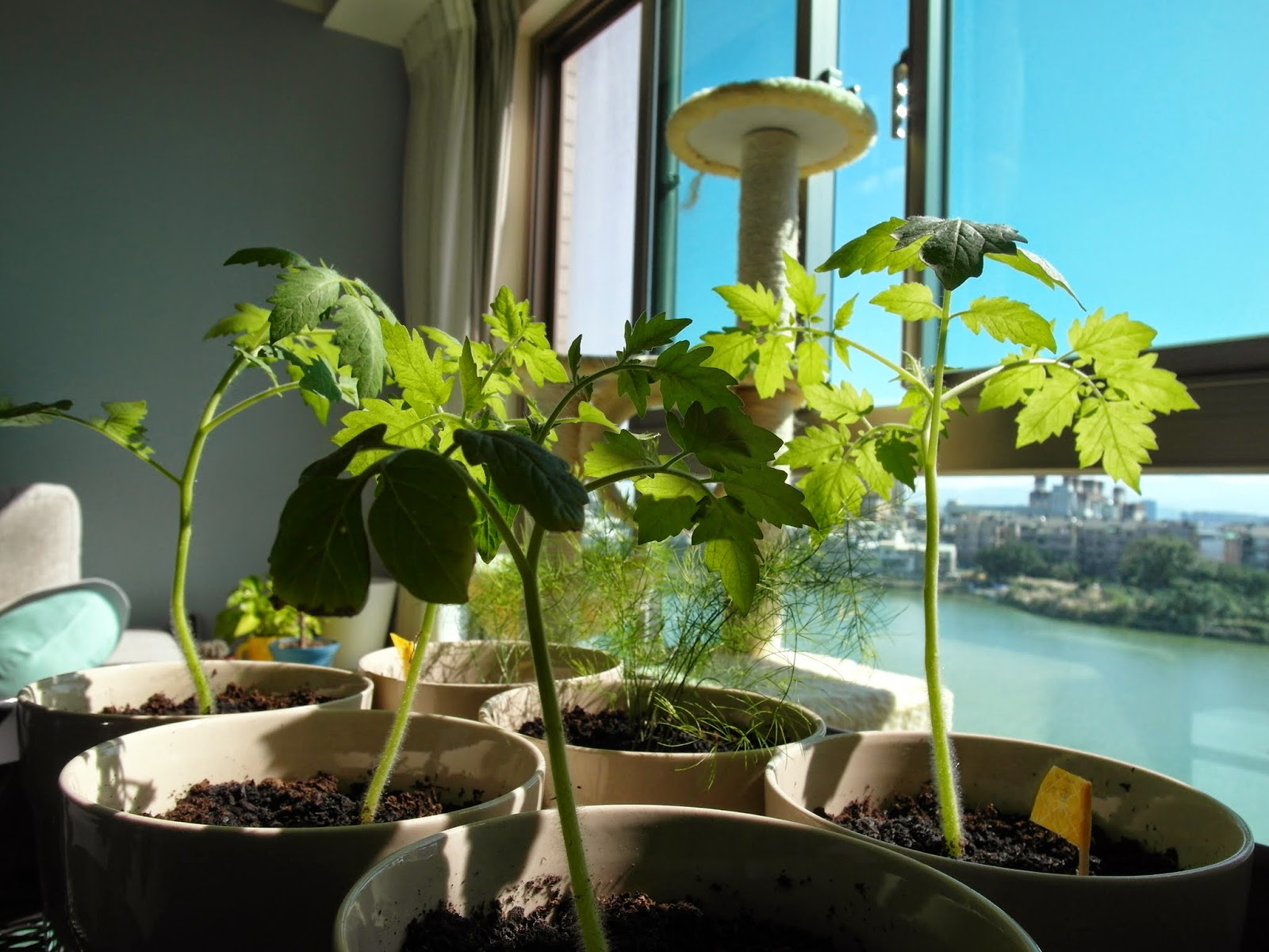 將買回來的蕃茄小苗移盆,此時的小苗長得東倒西歪的。盆子是用IKEA買的特價品,底部沒有洞,事後證明萬萬不可用沒洞的盆子來種植物!