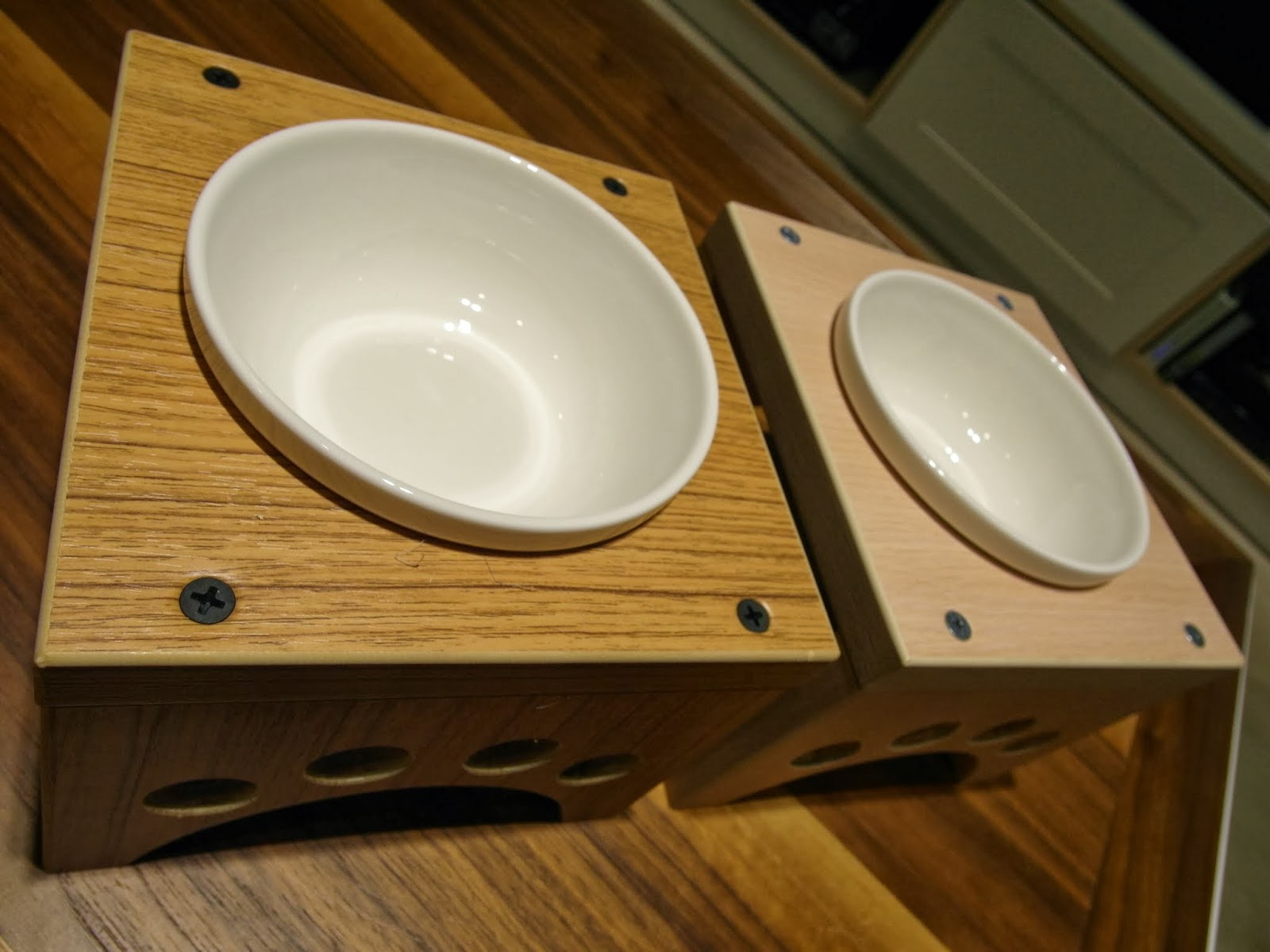 MOMOCAT餐桌號稱是符合貓體工學,有單口碗至四口碗可供選擇,我是買了兩個單口的,因為想必胖咪與可樂是不可能並肩而坐一起共同用餐的。木頭桌子有三個色可以選:天然白橡木色/黃金柚木木色/曼特寧木色,我挑了黃金柚木木色(左)for胖咪,天然白橡木色(右)for可樂。上面的碗是強化瓷碗,可加熱微波(我目前是還沒用這個微波過啦),另外有白鐵碗可供選擇。