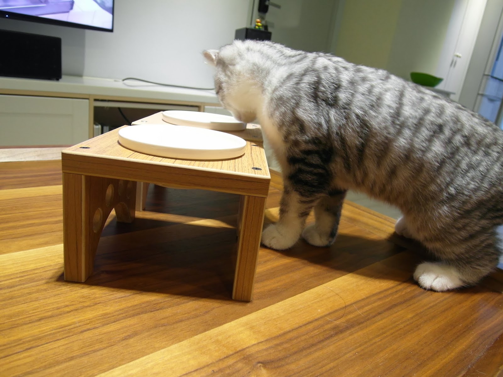 雖然以前就有聽說過「貓咪是屬於吞食的動物,不太會去咀嚼食物」的這種說法,但偶爾看到她吐出''完整顆粒''的飼料,還是覺得有點嚇人。她這樣吃太快消化不良,哪天真的出什麼事情還得了,所以想到以前看電視有看到寵物用餐桌,上網一找,找上了MOMOCAT,立刻買了兩個for雙貓用。